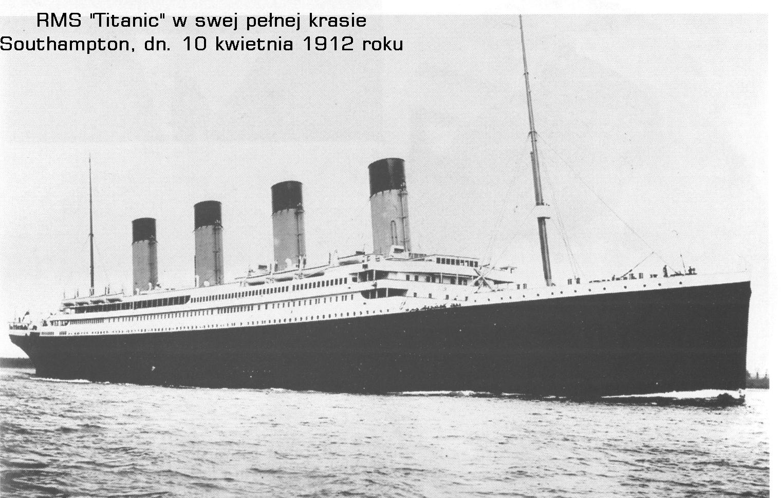 RMS Titanic był statkiem stanowiącym według słów ówczesnych komentatorów – pływający hotel klasy „Ritz”, a to ze względu na luksusy – rzecz jasna dla pasażerów I klasy. Miał on 66.000 ton wyporności, pojemność brutto – 46.328 ton, długość – 270 m, szerokość – 28 m, wysokość od stępki do mostka kapitańskiego – 32 m. dwie maszyny parowe i turbiny o łącznej mocy 51.000 KM, trzy śruby napędowe, 29 kotłów, 11 pokładów i 2.500 miejsc dla pasażerów. Ta całość pchana potęgą pary, na której ogrzanie potrzeba było każdej doby 800 ton bunkru węglowego, poruszała się z prędkością podróżną 22 węzłów (kts) – czyli 40,7 km/h.